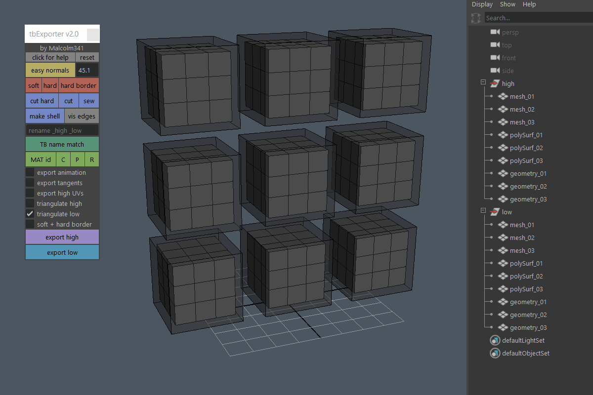 -TB name match appends a high and low suffix to selected meshes for name matching in Marmoset Toolbag or Substance Painter. Selected meshes contained in a group named high or low will be renamed to whatever you type and will automatically get high_01, high_02, high_03, etc. as a suffix which makes name matching work with one click