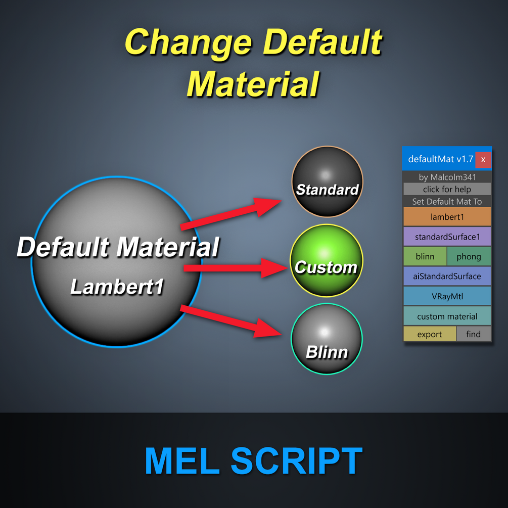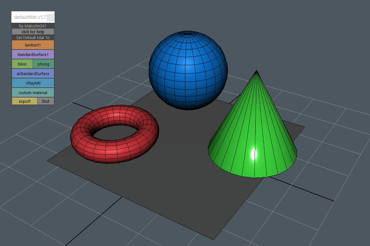 -Toggle existing built in default material overrides lambert1, standardSurface1, blinn, phong, aiStandardSurface, VRayMtl on/off for the scene
