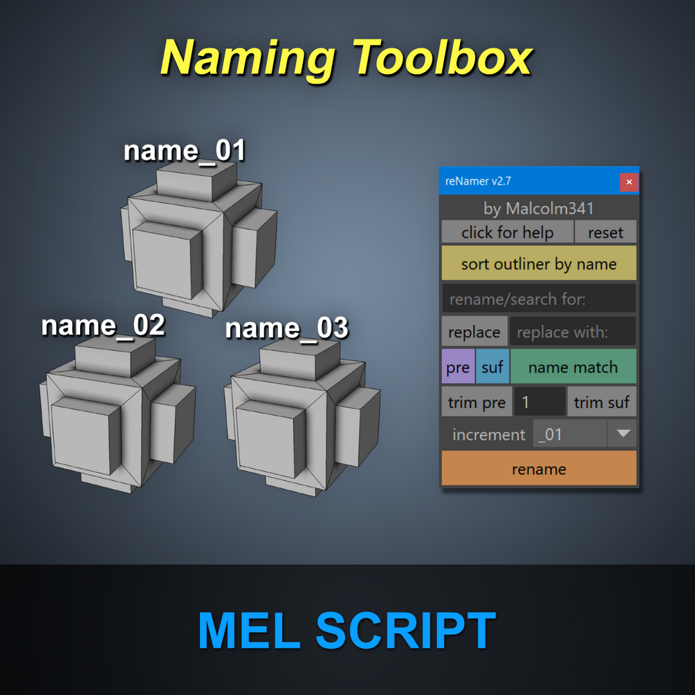-Increments don't add an extra zero to the front of the name like other naming tools I've seen online. For example this won't happen _09, _010, instead the tool will increment correctly _09, _10
