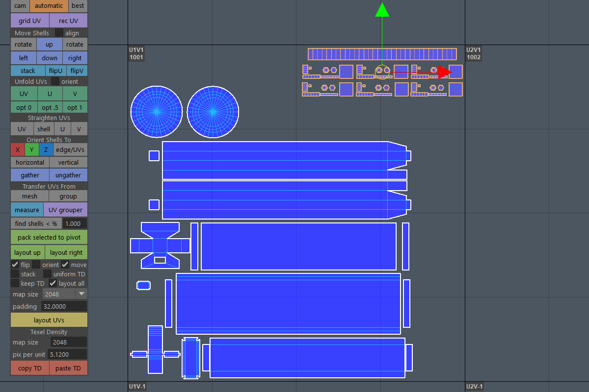 -Pack selected UV shells to the current selection pivot. Great for organization and quickly clustering shells together with the correct padding