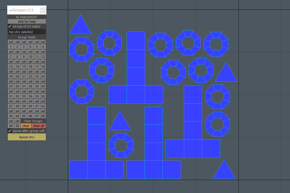 -UV shell grouping system allows you to choose which UV shells stack during UV layout and which don't with up to 50 groups