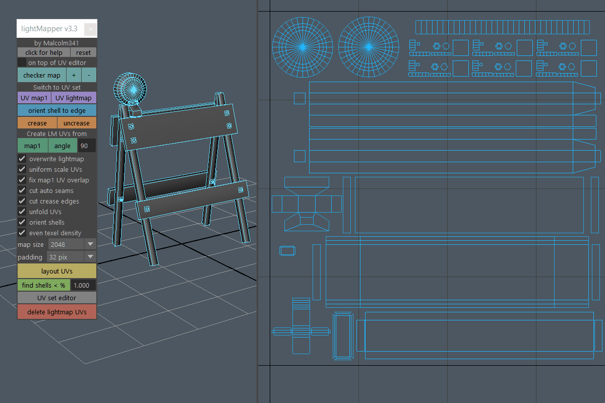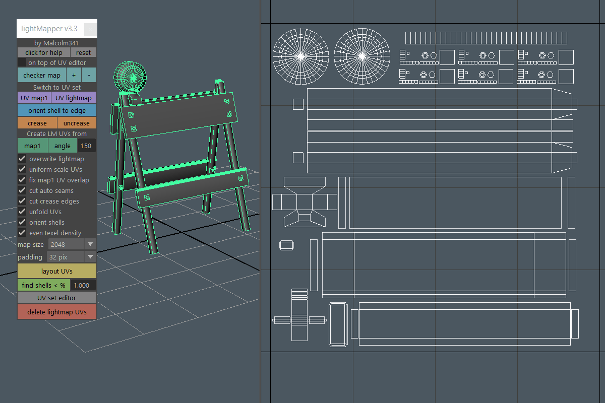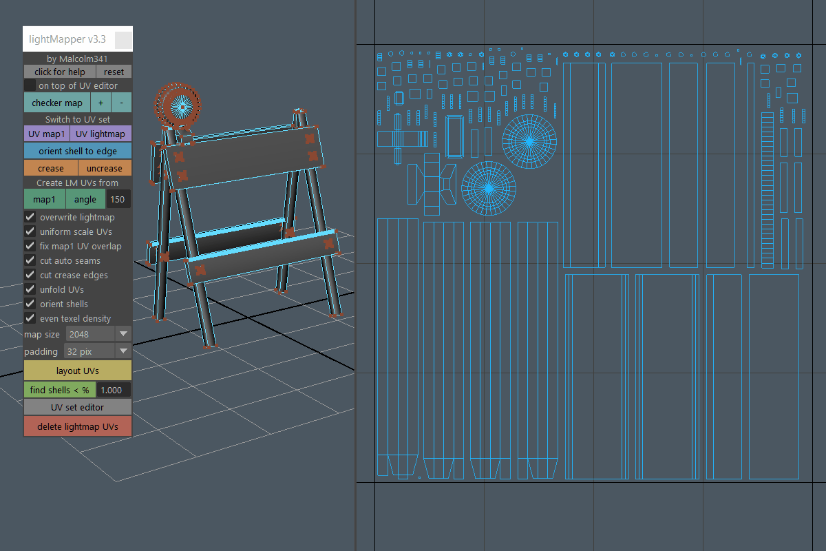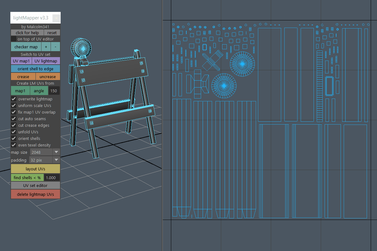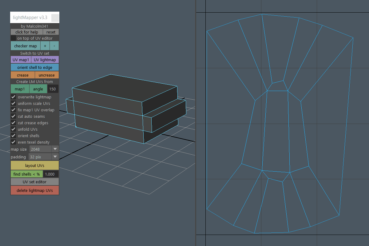 Create light map UVs for selected meshes in one click. Use the angle method for minimal seams, or use the map1 method to automatically convert your map1 UVs into usable light map UVs. Stop wasting time with light map UVs in Autodesk Maya.